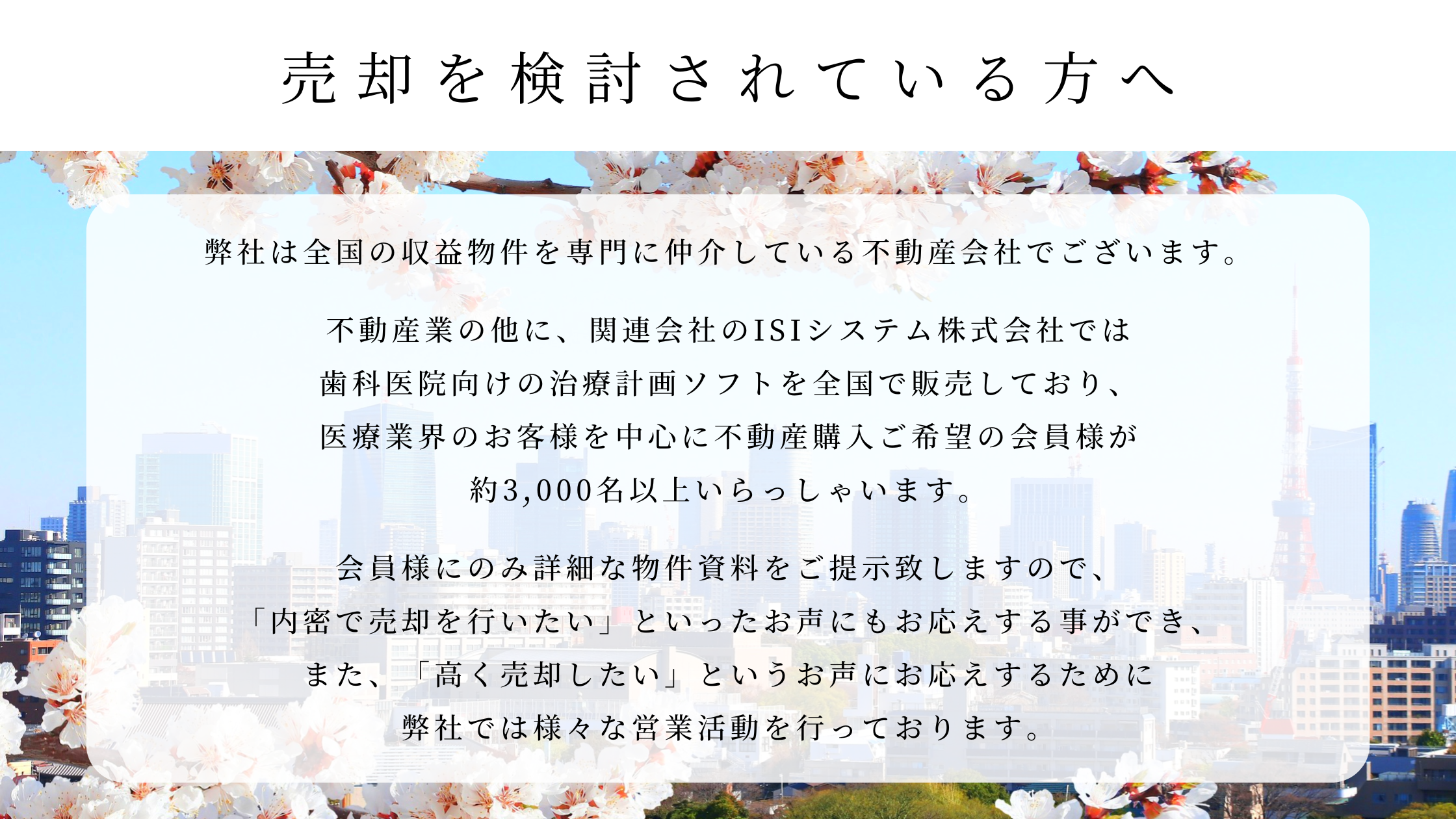| 顧客 | 医師、上場企業役員・管理職、大家業の方等3,000名以上の富裕層が会員登録しており、年収・金融資産・購入希望エリア・購入条件等詳しく把握している為、売却物件が発生した場合は速やかに購入希望顧客を見つける事が出来、周囲に知られる事なく売買を行う事が出来ます。 | 収益レジを専門には取扱っていない為、売却依頼を受けてから購入顧客を探します。 購入顧客を探す為にレインズ等に広告を出す為、物件が売りに出た事が広く様々な方に周知され、あらぬ噂が発生する事があります。 |