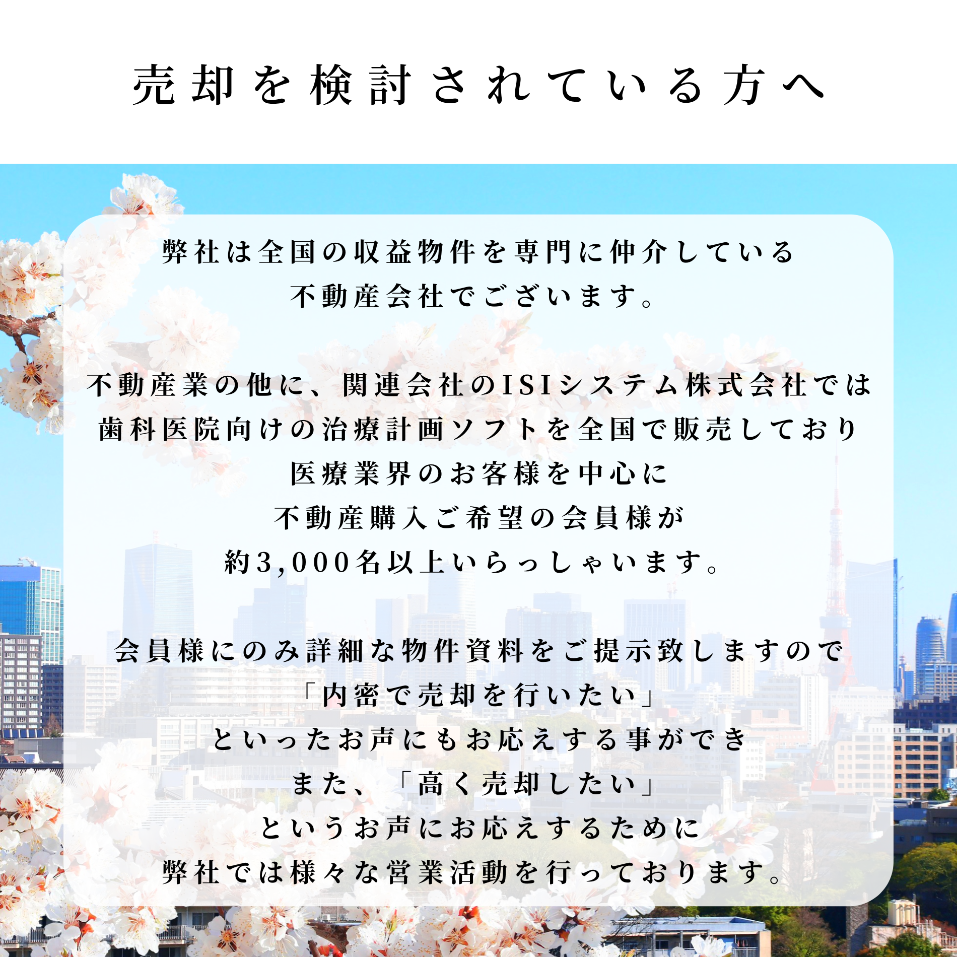 収益法、積算方法等、現在売却価格をお伝えしております。(しかし、金融機関、お客様の属性によって多少変化する事はあります。)弊社は収益法をとっておりますので、事前に家賃、共益費、駐車料金、太陽光、電信柱、看板、自販機、携帯電話機アンテナ使用料等 情報をご教示頂きますと、1時間以内に査定額をお伝えする事が可能です。